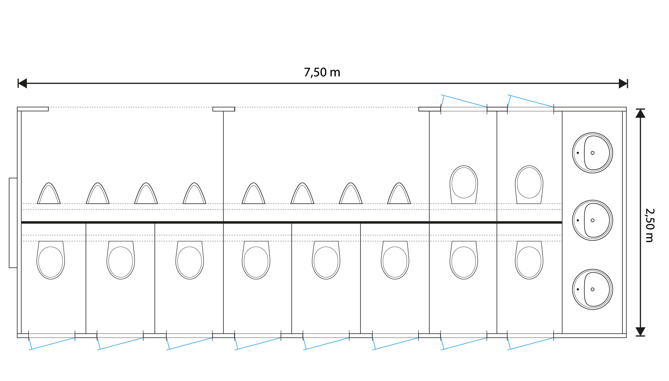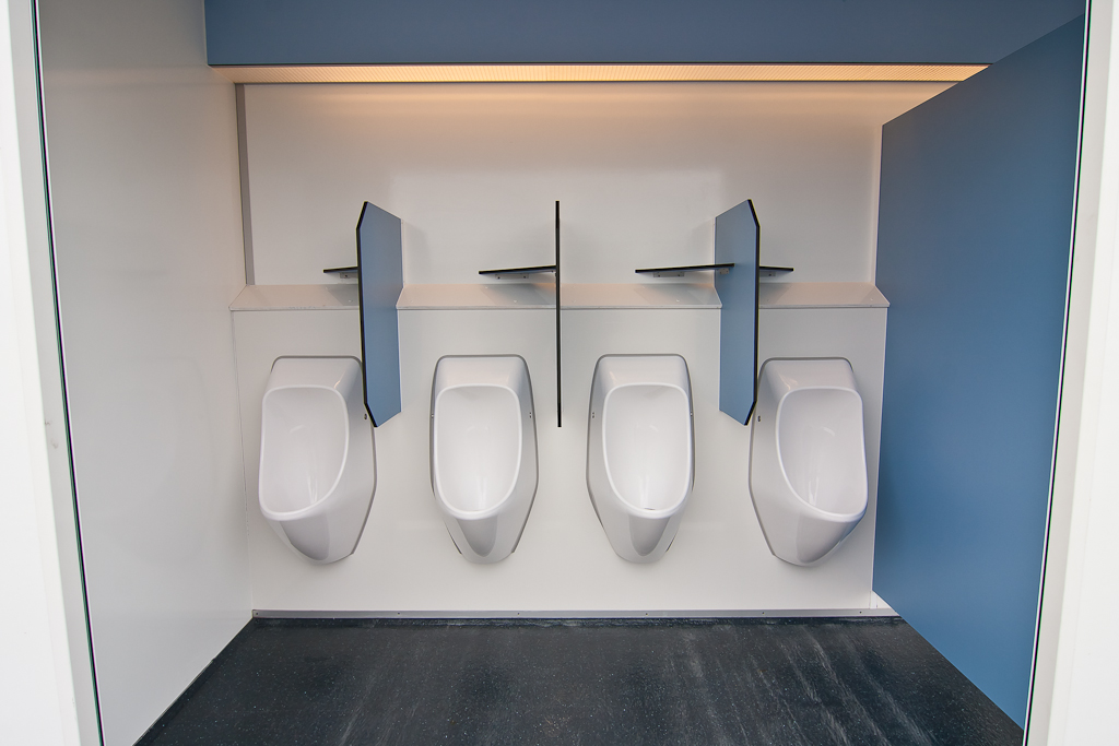 Ten eerste beschikt onze 18 persoons toilet unit over 13 toiletten, vier waterloze urinoirs en drie wastafels voor snelle opfrismogelijkheden. Daarnaast zijn de rolluiken handig voor gemakkelijke in- en uitgang en biedt de spiegeloptie de mogelijkheid om te kiezen of het urinoirgedeelte links- of rechtsom moet worden geplaatst. Deze opzet van de toilet unit zorgt voor een vlotte doorstroom van gebruikers en voorkomt lange wachttijden. De kwaliteit van de unit is goed om met te werken en staat mooi op jouw evenement of festival.