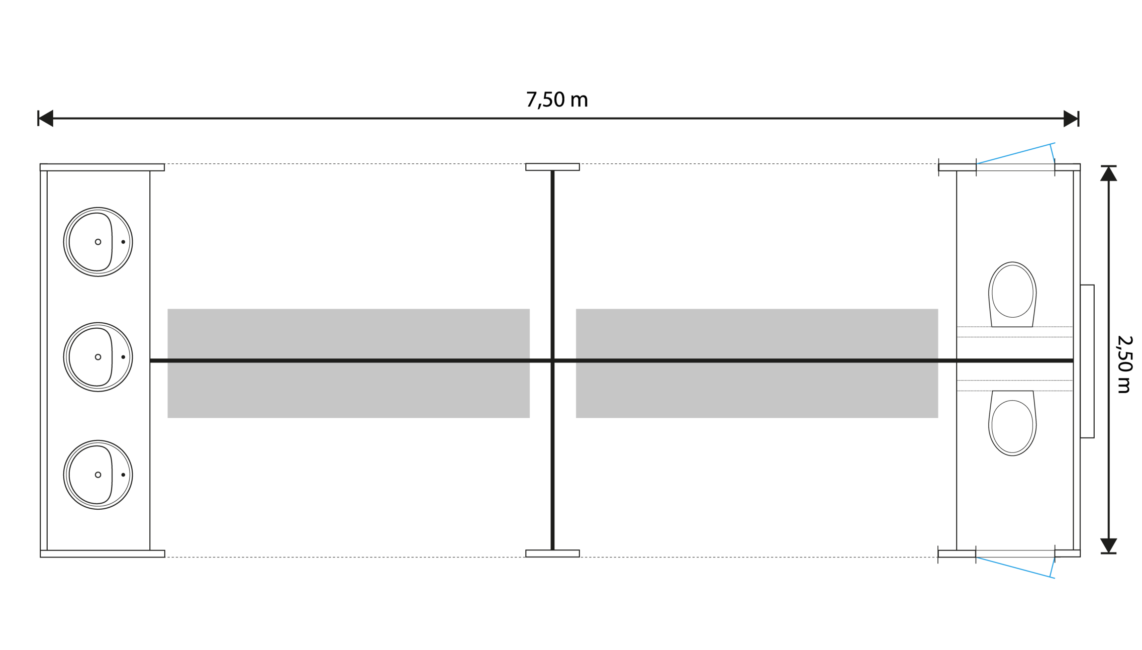 De unit is opgedeeld in twee aparte gedeelten: twee losse toiletten en het andere gedeelte beschikt over vier grote plasgoten, wat niet alleen milieuvriendelijk is, maar ook zorgt voor een snelle doorstroom van gebruikers. Daarnaast zijn er drie wastafels aanwezig, zodat iedereen zijn handen kan wassen na gebruik van het toilet. De wastafels zijn voorzien van zeepdispensers en handdoekhouders, wat bijdraagt aan de hygiëne en het comfort van de gebruikers. Verder is het ook mogelijk om jezelf op te frissen bij de spiegels.