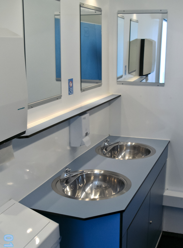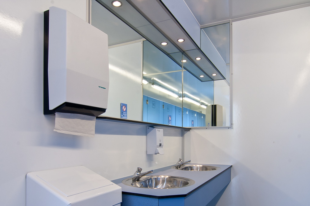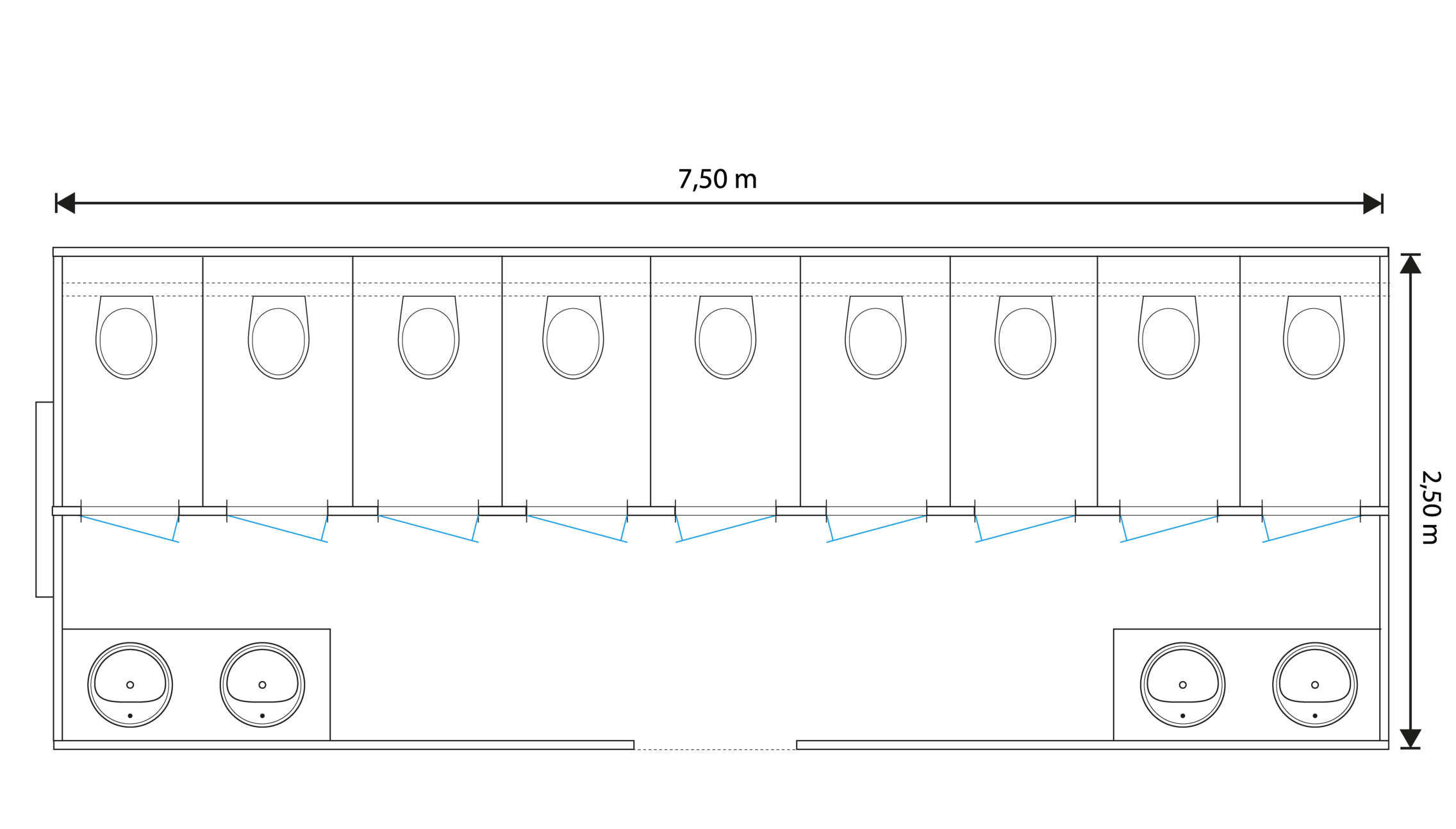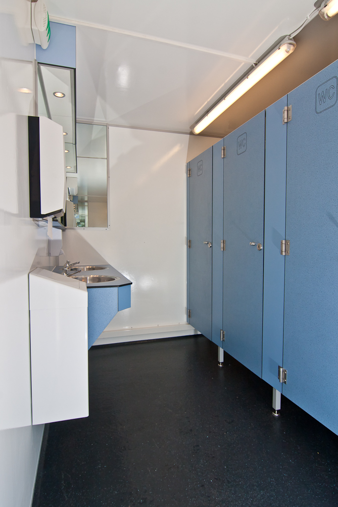 Makkelijk de ruime toilet unit huren die is uitgerust met negen toiletten en vier wastafels aan de binnenkant. Dit biedt jouw bezoekers altijd toegang tot schone en hygiënische faciliteiten, wat cruciaal is voor hun comfort en tevredenheid. Het ruime interieur van de unit zorgt ervoor dat iedereen droog blijft, zelfs tijdens slecht weer. Hierdoor hoef je je geen zorgen te maken over het welzijn van jouw gasten. Dankzij het geïntegreerde rolluik is het in- en uitlopen van de unit eenvoudig en probleemloos. Dit slimme ontwerp zorgt voor een vloeiende doorstroming van mensen, zelfs tijdens drukke momenten. Daardoor voorkom je lange wachttijden en bied je jouw bezoekers een comfortabele ervaring op het evenementen of bij festivals. Het gebruiksgemak van deze unit maakt het een uitstekende keuze voor diverse evenementen en projecten. De sanitair unit is zeer flexibel in gebruik en kan zowel als dames- of herentoilet worden ingezet.