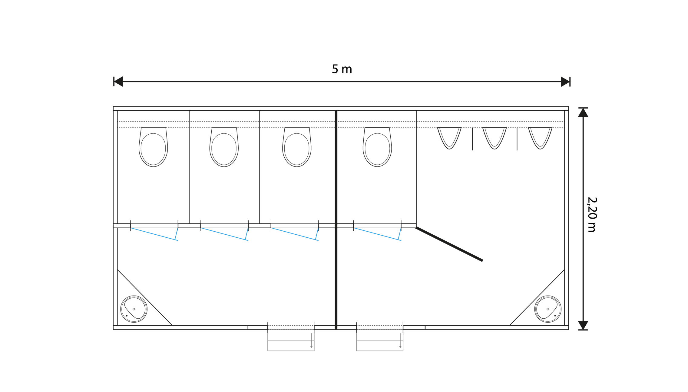 Onze toiletwagen huren is mogelijk en is ontworpen om aan diverse gebruikersbehoeften te voldoen, met drie dames toiletten, één heren toilet en drie urinoirs. Voor maximale privacy is deze voorzien van een gescheiden heren- en dames instap.