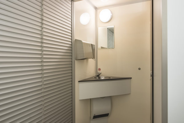 Onze toiletwagen onderscheidt zich door de zwevende toiletten aan zowel de dames- als herenzijde. Deze moderne toiletten zijn voorzien van hoogwaardig RVS garnituur, waardoor ze niet alleen duurzaam zijn maar ook een luxe uitstraling met zich meebrengt. De grote spiegels boven de wastafels bieden gebruikers de mogelijkheid om zichzelf op te frissen. Ook helpen de elektrische handdrogers en zeepdispensers om een hygiënische omgeving te verzorgen voor de bezoekers.